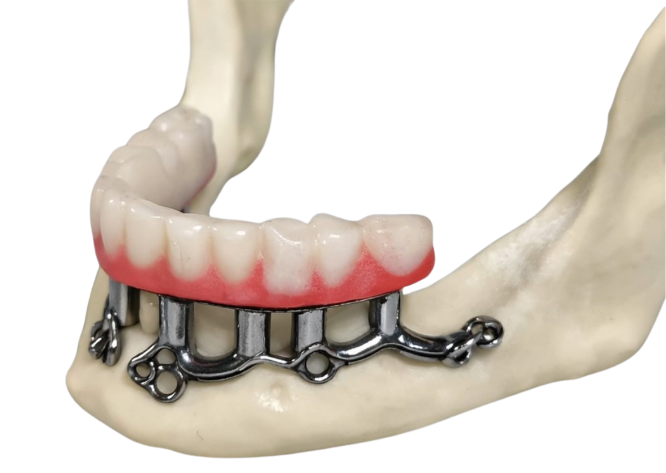 Subperiosteal implant with teeth on a 3D-printed mandible.